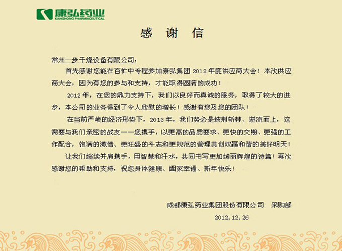 公司收到一封成都康弘藥業(yè)集團(tuán)股份有限公司寄來的感謝信,感謝常州一步2012年熱情、周到服務(wù)。康弘藥業(yè)在2012年訂購了我公司一套固體制劑制粒連線和中藥浸膏專用噴霧干燥機(jī)等設(shè)備,合同價(jià)達(dá)500多萬元。作為我公司的大客戶,公司嚴(yán)格按照?qǐng)D紙及標(biāo)準(zhǔn)要求組織生產(chǎn),按時(shí)交貨。在安裝調(diào)試現(xiàn)場(chǎng),想客戶之所想,急客戶之所急,辦事認(rèn)真,服務(wù)熱情,康弘藥業(yè)對(duì)一步公司規(guī)范的管理、優(yōu)質(zhì)的服務(wù)所感動(dòng)。