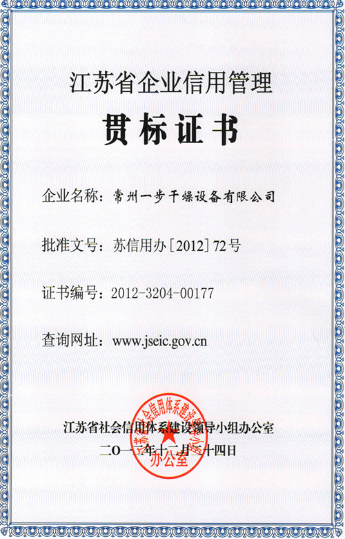 公司認真貫徹落實蘇信用辦【2012】7號文件精神,在2012年10月份按照《江蘇省企業信用管理規范(試行)》的要求,進行信用貫標,在2012年12月順利通過“企業信用管理”貫標驗收,并喜獲江蘇省企業信用貫標證書。